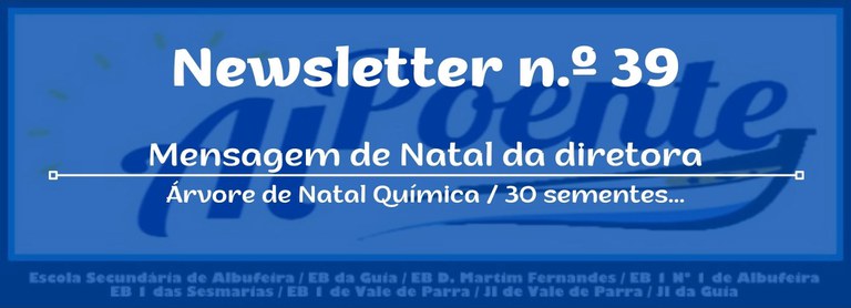 Newsletter n.º 39 Mensagem de Natal da Diretora https://www.alpoente.gov.pt/agrupamento/noticias/newsletter-n-o-39 https://www.alpoente.gov.pt/agrupamento/noticias/newsletter-n-o-39/@@download/image/newsletter-39.jpeg Newsletter n.º 39 Mensagem de Natal da Diretora Mensagem de Natal da diretora do Agrupamento Árvore de Natal Química 30 Sementes... Votos de Feliz Natal ao Agrupamento!